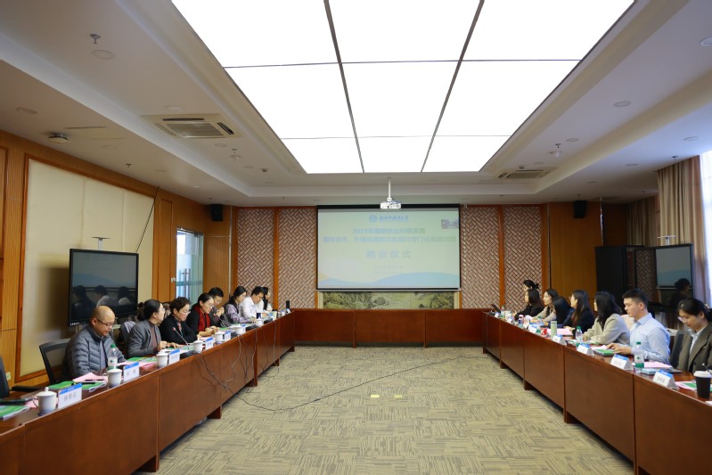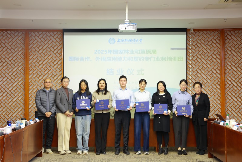 2025年12月26日,第九期国家林业和草原局国际合作、外语应用及履约专门业务培训班结业仪式在上海外国语大学松江校区举行。国家林业和草原局国际合作司司长夏军、二级巡视员武立磊在线出席。上海外国语大学继续教育学院党总支书记吴慧、英语学院党委副书记曹姝婧、后勤工作管理处副处长陆钛栋、教师代表及全体学员参加仪式。仪式由继续教育学院党总支副书记韩薇主持。