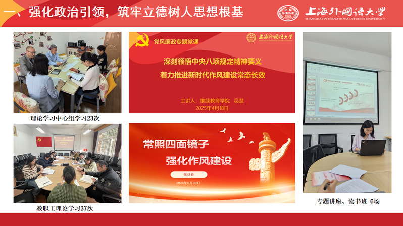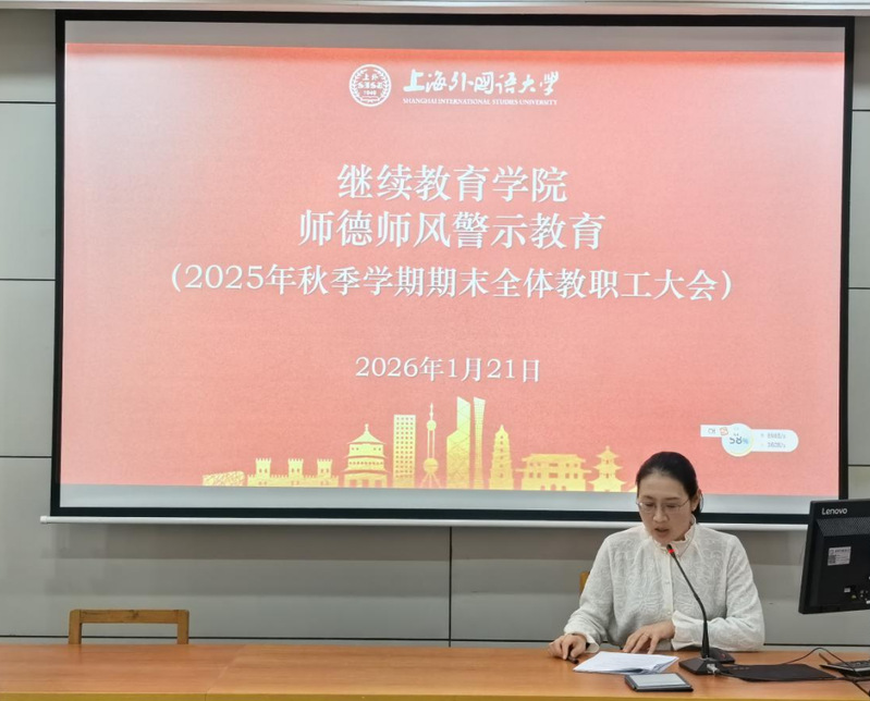 韩薇副书记在会上开展了师德师风警示教育。她带领全体教职工深入学习了《上海外国语大学关于健全新时代师德师风建设长效机制的实施意见》和《上海外国语大学教师师德失范行为处理办法》等文件精神,并结合近年来教育系统中发生的典型案例进行系统剖析与严肃提醒。她强调,全体教职工要进一步筑牢思想防线,严守职业底线,将师德规范内化于心、外化于行,切实履行好立德树人的根本职责,共同营造风清气正的育人环境。
