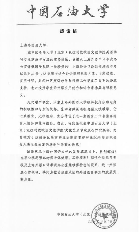 近日,上海外国语大学收到中国石油大学(北京)克拉玛依校区的感谢信。信中不仅饱含对援疆教师辛勤付出的诚挚谢意,更对学校长期以来在支援新疆教育发展、推动区域教育协作等方面的突出贡献给予高度认可。